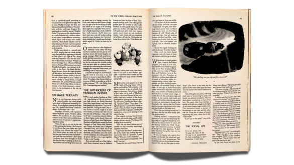 The resulting story, “The Shit-Kickers of Madison Avenue,” appeared in the magazine’s seventieth-anniversary issue, in February, 1995. It runs sixteen hundred words—long for a Talk piece, short for an instant classic—and is filled with gabby, anxious, kooky, self-dramatizing teen talk. (“I sweat Henry? Who you sweat? Anybody?”) Ross, a longtime Upper East Sider, had noticed the daily flight path of private-school kids—Nightingale girls, Buckley boys—along the west side of Madison (the “cool” side). She observed them in the wild, like a nature documentarian watching a herd of grazing antelopes, as they kissed hello and showed off their new lace-up boots, or “shit-kickers.” She begins, “The tenth graders heading up Madison Avenue at 7:30 A.M. to the private high schools are freshly liberated from their dental braces, and their teeth look pearly and magnificent. They are fifteen years old.” When I started writing Talk pieces, eleven years later, I read and reread “Shit-Kickers,” trying to absorb its joyful simplicity. Ross always made it look easy.