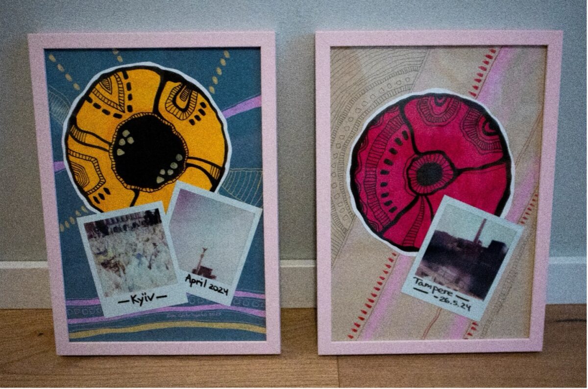 This two-piece artwork (each piece in A4 size) explores the simultaneous coexistence of multiple truths and rifts between realities in the contexts of Finland and Ukraine. The cotton-candy sweet aesthetic and the practice of scrapbooking, often associated with making memories of travels, here show the movement of a diaspora Ukrainian in Finland (the artist herself) between Tampere, Finland, and Kyiv, Ukraine, in April-May 2024. The instant prints, collaged into the artwork, show respectively: