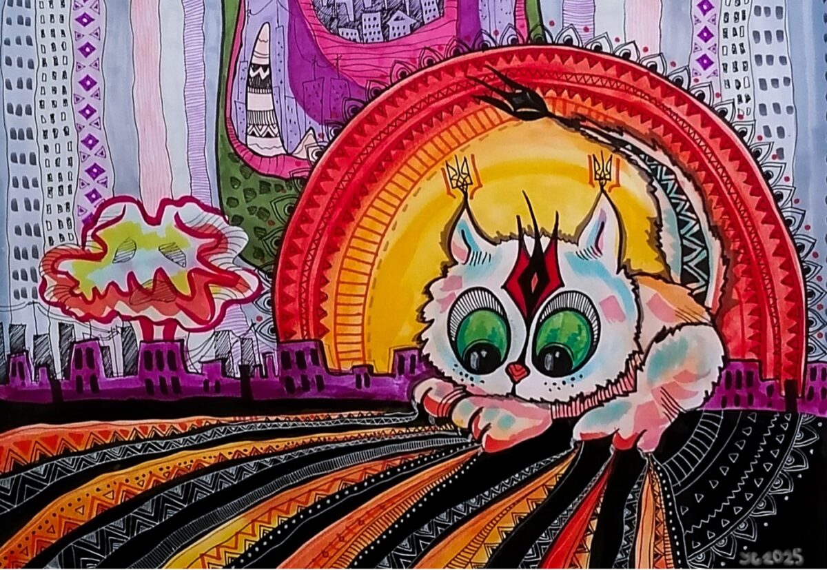 The explosion behind Bavovnyatko has circular shapes and patterns, in many contexts referencing harmony. That’s because Bavovnyatko makes good/needed explosions (read above). There is an ugly explosion too, which is purposefully made out of style in the drawing and out of style in my artwork in general. That one is an indicator of war crimes committed against Ukraine. And one thing I think we, Ukrainian artists, had to learn is how to let ugliness (like that explosion) into our work – because we would be very unworthy to be called artists if we beautified cruelty. […] This piece was made with markers, liners, ink, watercolors, pens.”
