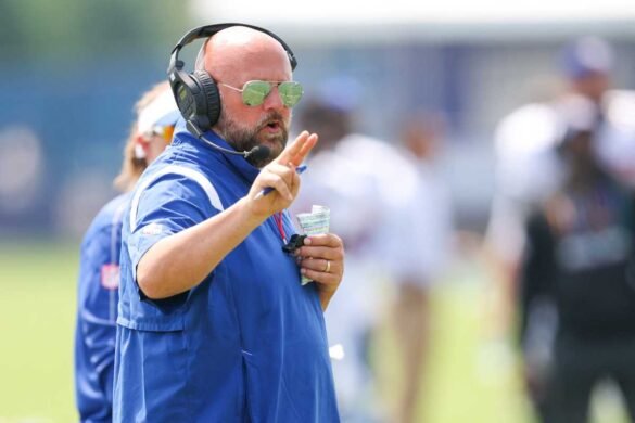 Aug 4, 2025; East Rutherford, NJ, USA; New York Giants head coach Brian Daboll reacts during training camp at Quest Diagnostics Training Center. Mandatory Credit: Vincent Carchietta-Imagn Images