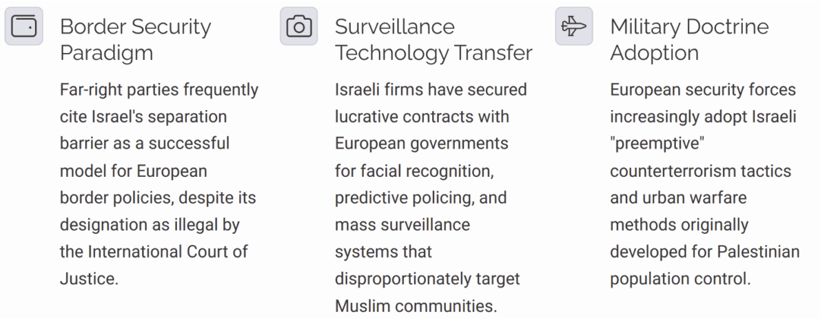 For European far-right movements, Israel represents an aspirational model for securitization policies. The Israeli security apparatus—with its sophisticated surveillance systems, border walls, biometric identification protocols, and preemptive strike doctrines—offers a template for the far-right’s vision of “defending” European civilization against perceived external threats. Parties like Italy’s Lega, Hungary’s Fidesz, and Austria’s Freedom Party explicitly reference Israeli security policies as justification for their own anti-immigration agendas. The material dimension of this alliance is substantial: Israel has become a significant exporter of security technologies to European countries with far-right governments, creating economic incentives for continued partnership.