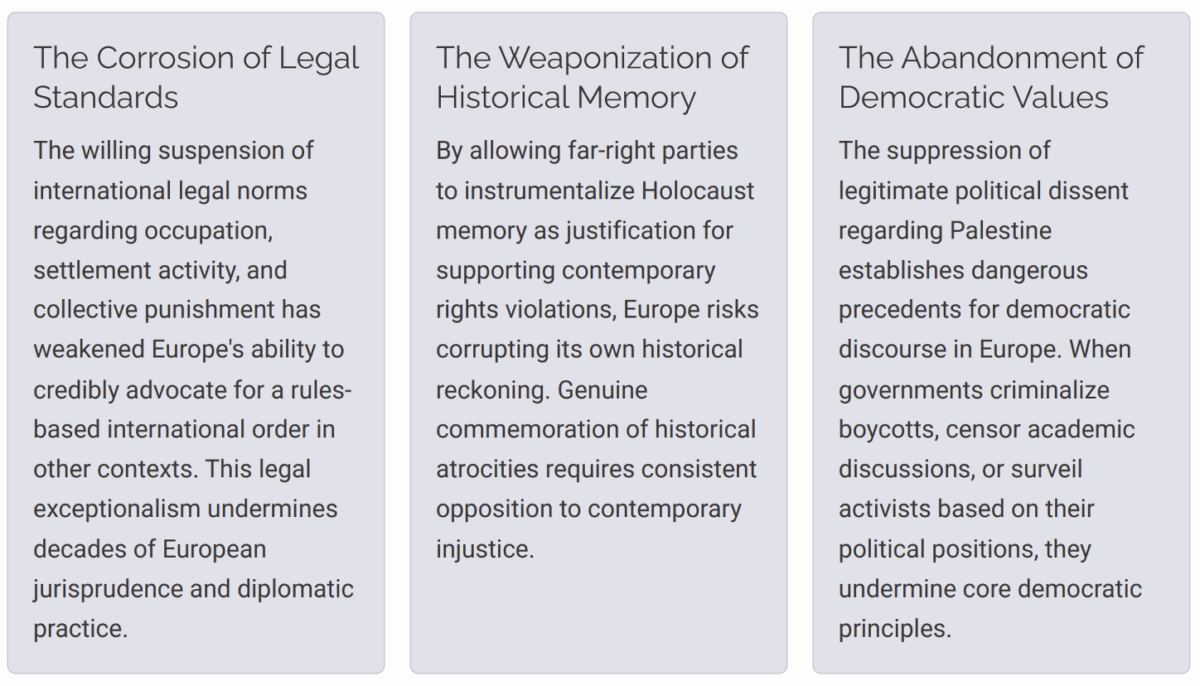 Perhaps most concerning are the domestic democratic costs of this alliance. The securitarian logic that justifies repression of Palestinians has been imported into European political systems, expanding surveillance authorities, restricting free expression, and normalizing exceptional legal measures against Muslim citizens and Palestine solidarity activists. The conflation of legitimate criticism of Israeli policies with antisemitism has poisoned democratic debate, while empowering precisely those far-right forces that have historically threatened both Jewish and Muslim communities in Europe.
