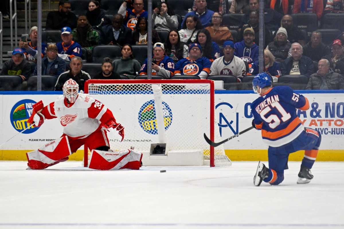 After Dylan Larkin spoiled Rittich’s shutout 3:11 into the third period, the Islanders swung back with two goals in 38 seconds. Heineman picked up his second on a similar rush alongside Horvat, slipping a one-timer off the pad of Talbot and in at the 7:19 mark.