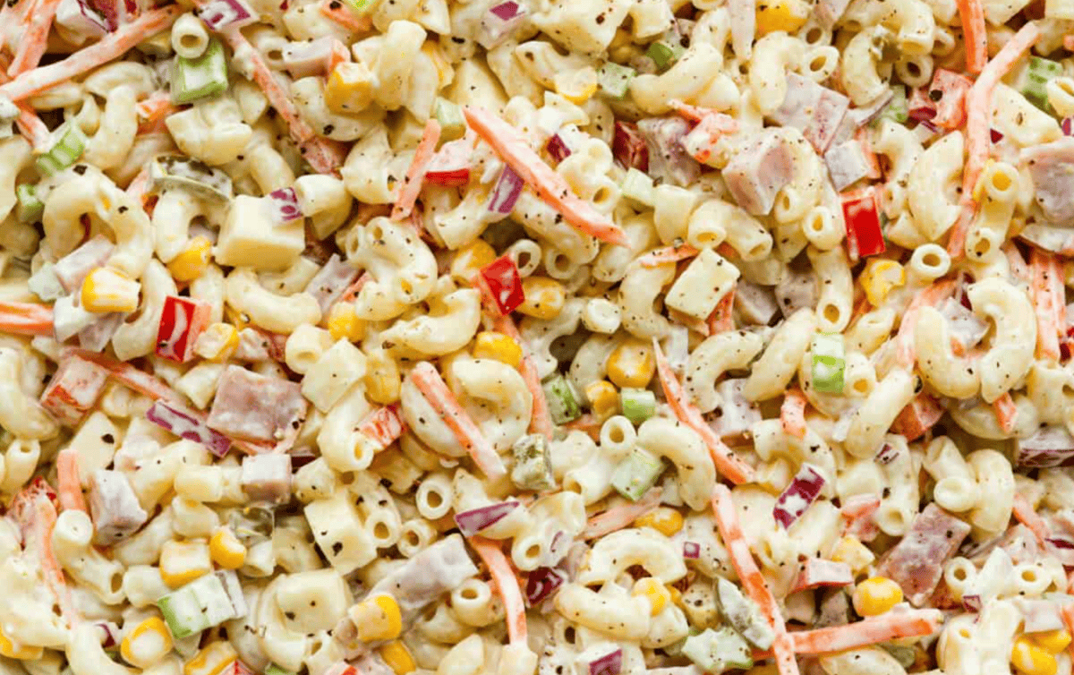 - Combine: To the bowl of pasta, add diced ham, corn, shredded carrots, diced bell pepper, Monterey jack cheese, diced celery, diced red onion, and chopped pickled jalapeño.