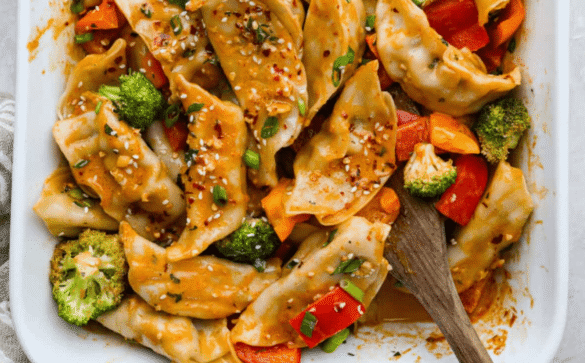 - Arrange the Potstickers and Veggies: Arrange the potstickers in an even layer at the bottom of the baking dish, then distribute your choice of veggies over the top.